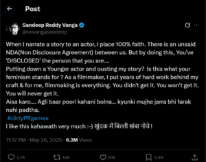 बीती रात संदीप ने X अकाउंट पर एक क्रिप्टिक पोस्ट शेयर किया। उन्होंने दीपिका का नाम तो नहीं लिया, लेकिन उनपर ‘गंदे पीआर गेम’ खेलने और उनकी फिल्म की कहानी के कुछ हिस्सों का खुलासा करने का आरोप लगाया है। उन्होंने लिखा, ‘जब मैं किसी एक्टर को कहानी सुनाता हूं, तो मैं उस पर 100% भरोसा करता हूं। हमारे बीच एक अनकहा एनडीए (नॉन डिस्क्लोजर एग्रीमेंट) है, लेकिन ऐसा करके आपने उस व्यक्ति का ‘डिस्क्लोजर’ कर दिया है जो आप हैं…।’