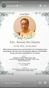 Mannara Chopra Father Death: प्रियंका चोपड़ा के परिवार में एक दुखद खबर सामने आ रही हैं। एक्ट्रेस की कजिन बहन मन्नारा चोपड़ा (Mannara Chopra) के पिता डवोकेट रमन राय हांडा का निधन हो गया है। उनके पिता का 72 वर्ष की आयु में मुंबई में निधन हो गया था। वह कुछ समय से अस्वस्थ थे। बीते 16 जून को सुबह सुबह ये खबर सोशल मीडिया पर वायरल हुई। वहीं दोपहर होते-होते मन्नारा अपनी बेहद के साथ मुंबई एयरपोर्ट पर नजर आई।