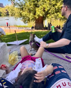 एक और फोटो में मालती जमीन पर लेटी हुई हैं और उनके बगल में पापा निक बैठे हैं। पास में ही पालतू डॉग भी है। सभी ने पार्क में पिकनिक मनाई।